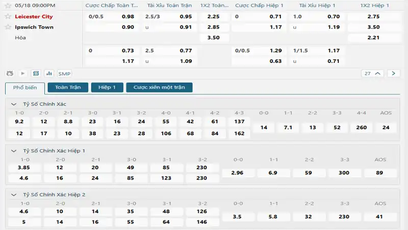 Bảng tỷ lệ kèo bóng đá trận đấu Leicester City vs Ipswich