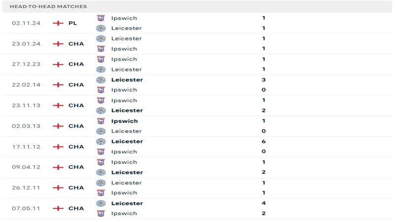 Lịch sử đối đầu của Leicester City vs Ipswich