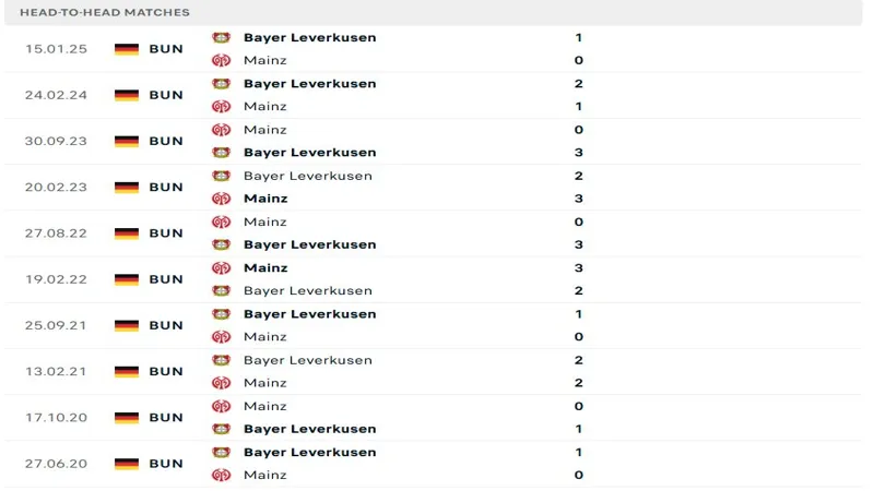 Lịch sử đối đầu của Mainz vs Bayer Leverkusen