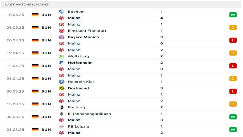 Mainz bước vào trận đấu cuối cùng của mùa giải Bundesliga năm nay với hành trang là chiến thắng đầy ấn tượng 4-1 ngay trên sân của Bochum. Đây là một cú hích lớn về mặt tinh thần khi chiến thắng đó đã giúp đội bóng này chấm dứt chuỗi 7 trận liên tiếp toàn hòa và thua – một giai đoạn sa sút khiến Mainz từng đứng trước nguy cơ bị đá văng khỏi top giữa bảng xếp hạng.