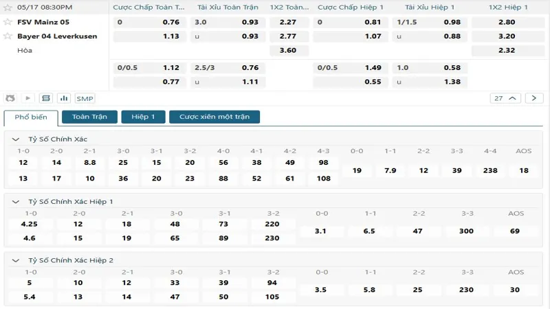 Bảng tỷ lệ kèo bóng đá trận đấu Mainz vs Bayer Leverkusen