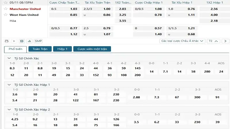 Bảng tỷ lệ kèo bóng đá trận đấu Manchester United vs West Ham United