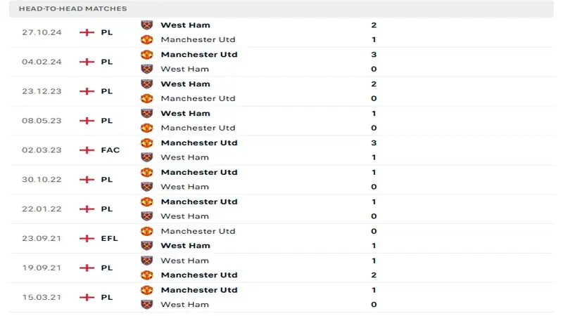 Trong 10 lần đối đầu gần nhất, Manchester United thắng 6, còn West Ham thắng 4. Dù có phần nhỉnh hơn về lịch sử, nhưng phong độ gần đây của Quỷ đỏ lại khá bất ổn khi chỉ thắng 2/8 trận gần nhất, để thua 4. West Ham cũng không khá hơn với chỉ 2 chiến thắng trong 10 trận, đi kèm 4 trận hòa và 4 thất bại.