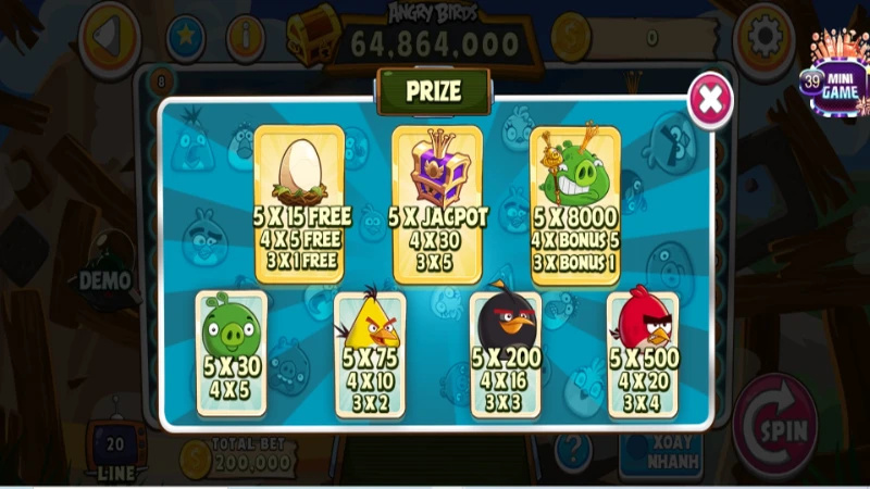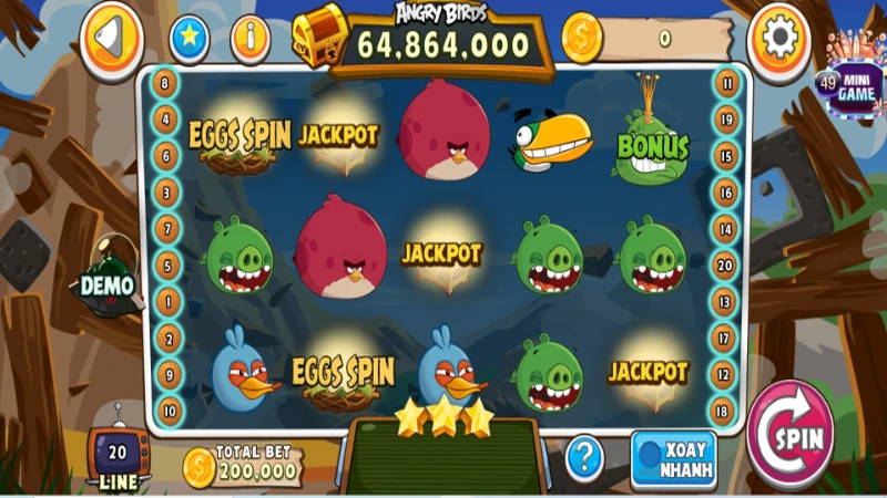 Ngoài ra, tính năng “Nổ Jackpot” là điểm nhấn lớn. Với mỗi vòng quay, bạn có cơ hội kích hoạt giải thưởng siêu lớn thông qua biểu tượng Angry Birds đặc biệt. Điều này làm tăng tính hồi hộp và hấp dẫn, khiến bạn muốn quay mãi không thôi.
