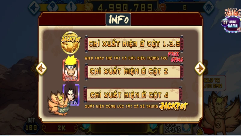 Các biểu tượng như Chidori của Sasuke hay Rasengan của Naruto chính là những yếu tố quan trọng trong game. Khi các biểu tượng này xuất hiện, cơ hội trúng thưởng của bạn sẽ cao hơn rất nhiều.