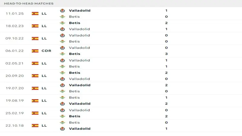 Cụ thể, trong các lần đón tiếp Valladolid tại sân nhà, Real Betis cũng có thành tích ấn tượng với 5 trận thắng và 1 trận hòa. Lần gần nhất so tài với nhau vào tháng 1 năm 2025, theo Vua 88 ghi nhận Real Betis đã giành chiến thắng với tỷ số tối thiểu khá tẻ nhạt trước Valladolid trên sân khách.