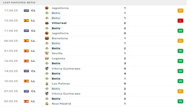 Về phong độ thi đấu hiện tại, Real Betis đang có mùa giải khá ổn định khi giành được 51 điểm sau 32 vòng đấu, đứng ở vị trí thứ 6 trên bảng xếp hạng La Liga. Trong 5 trận gần nhất, đội bóng này giành được 3 chiến thắng và 1 hòa, nhưng cũng để thua 1 trận trước Villarreal. Real Betis có 8 chiến thắng, 5 hòa và 3 thất bại trên sân nhà trong mùa giải này, cho thấy sức mạnh khá ổn định của họ khi chơi tại quê nhà.