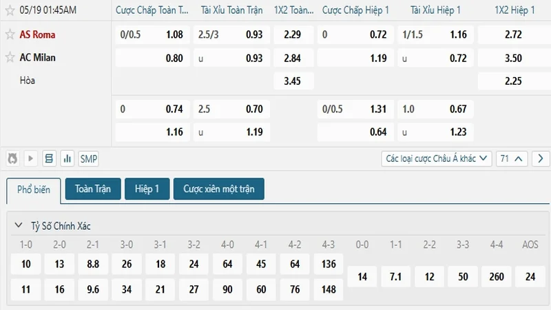 Bảng tỷ lệ kèo bóng đá trận đấu Roma vs AC Milan