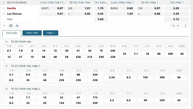Bảng tỷ lệ kèo bóng đá trận đấu Sevilla vs Las Palmas