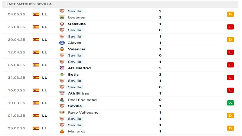 Trong khi đó, hàng thủ lại thường xuyên mắc sai lầm, để lọt lưới tới 46 bàn. Điều đó lý giải vì sao đội bóng xứ Andalucia đang phải ngụp lặn ở nửa sau bảng xếp hạng. Đáng chú ý, ở 3/4 trận gần nhất của Sevilla tại La Liga, số bàn thắng ghi được trong cả trận đều không vượt quá 2 – tiếp tục củng cố xu hướng trận đấu có tỷ số thấp.