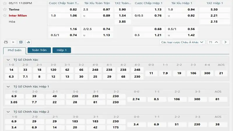 Bảng tỷ lệ kèo bóng đá trận đấu Torino vs Inter Milan