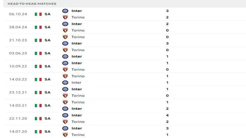 Trong 10 lần đối đầu gần nhất giữa Torino vs Inter Milan, theo Vua 88 lợi thế hoàn toàn nghiêng về phía đội bóng áo xanh đen thành Milano. Cụ thể, Inter đã bất bại cả 10 trận, giành tới 8 chiến thắng và chỉ để hòa 2 trận. Trong đó có nhiều chiến thắng với cách biệt tối thiểu cho thấy sự lấn lướt của Inter, dù Torino luôn chơi với tinh thần quyết tâm khi gặp đối thủ mạnh.