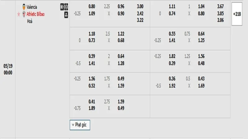 Bảng tỷ lệ kèo bóng đá trận đấu Valencia vs Athletic Bilbao