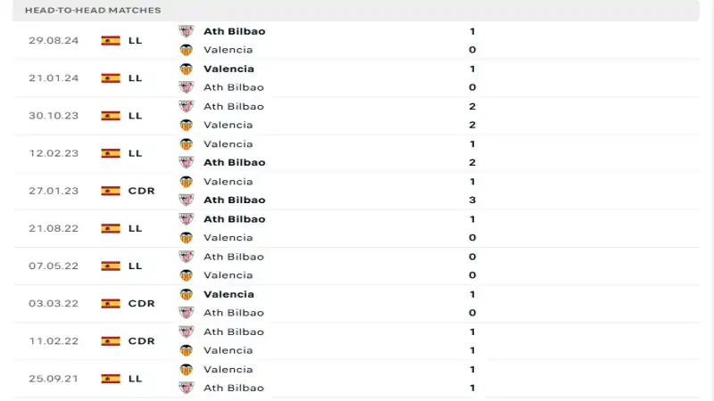 Đặc biệt, trong 5 lần Valencia tiếp đón Athletic Bilbao trên sân nhà, có đến 3 trận cũng kết thúc với kết quả tương tự, nghĩa là không quá 2 bàn thắng được ghi. Phong cách thi đấu chặt chẽ của hai đội đã trở thành đặc điểm quen thuộc trong những lần đối đầu giữa họ.