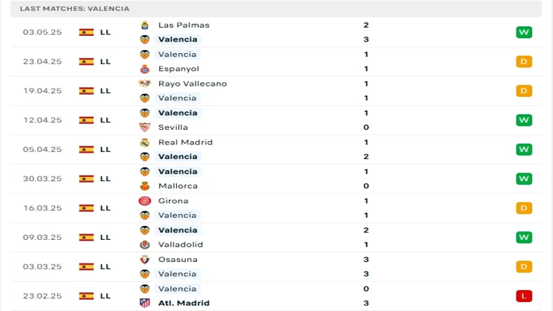 Ở vòng đấu gần nhất, Valencia đã có một chiến thắng đầy kịch tính với tỷ số 3-2 trước Las Palmas. Kết quả này không chỉ mang lại 3 điểm trọn vẹn mà còn giúp đội chủ sân Mestalla kéo dài chuỗi trận bất bại của mình lên con số 9. Trong 9 trận gần nhất tại La Liga, Valencia giành được 5 chiến thắng và 4 trận hòa – một phong độ hết sức ổn định trong bối cảnh mùa giải đang đi vào giai đoạn then chốt.