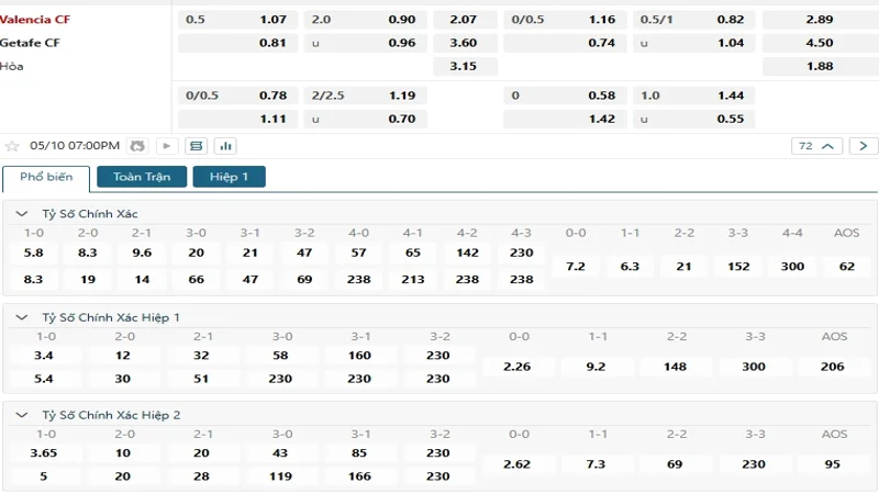 Bảng tỷ lệ kèo bóng đá trận đấu Valencia vs Getafe