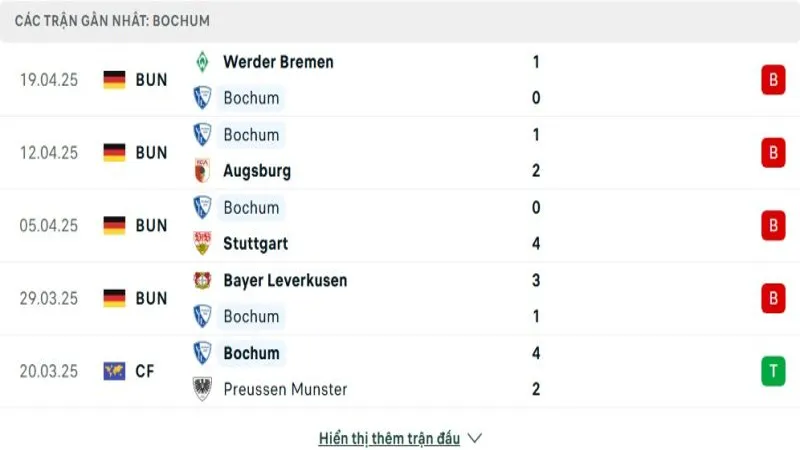 VfL Bochum đang rơi vào khủng hoảng với 5 thất bại liên tiếp gần đây. Những kết quả này khiến họ đứng ở vị trí thứ 17 trên bảng xếp hạng, chỉ còn 4 vòng đấu để cố gắng trụ hạng. Họ đã để thua các đối thủ mạnh như Werder Bremen và Augsburg, cho thấy sự yếu kém cả trong tấn công lẫn phòng ngự.