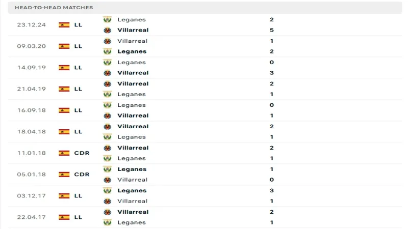 Xét về thành tích đối đầu tại sân nhà, Villarreal đã thắng tới 4 trong 5 lần gần nhất tiếp đón Leganes. Với phong độ hiện tại cùng lợi thế sân nhà, họ hoàn toàn có thể tái lập kịch bản đó một lần nữa, đặc biệt khi Leganes gần như không tạo được bất ngờ trong các chuyến làm khách mùa này.