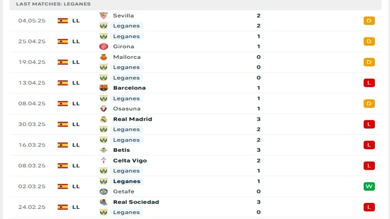 Sau 34 vòng đấu, Leganes mới chỉ có được 6 chiến thắng, 13 trận hòa và để thua tới 15 trận. Với 31 điểm, họ đang xếp thứ 19 trên bảng xếp hạng – tức là nằm trong nhóm xuống hạng. Khoảng cách giữa họ và nhóm an toàn hiện là 4 điểm. Tuy vẫn còn cơ hội trụ hạng, nhưng áp lực dành cho Leganes là rất lớn, đặc biệt khi lịch thi đấu còn lại khá khó khăn.