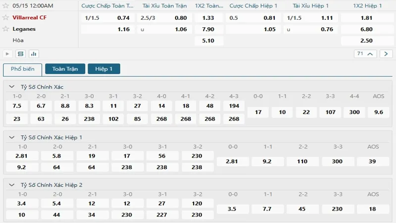 Ở kèo châu Âu, các nhà cái cũng đánh giá khả năng giành chiến thắng của Villarreal là rất cao. Tỷ lệ cược cho Villarreal chỉ ở mức 1.33, trong khi con số này của Leganes lên tới 7.90. Sự chênh lệch rõ rệt về tỷ lệ đã cho thấy sự khác biệt lớn giữa hai đội cả về phong độ, chất lượng đội hình lẫn vị trí trên bảng xếp hạng.