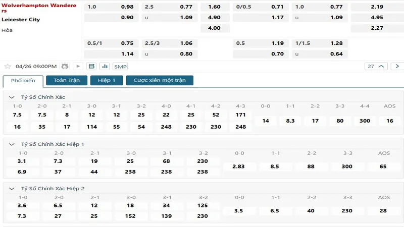 Bảng tỷ lệ kèo bóng đá trận đấu Wolves vs Leicester City