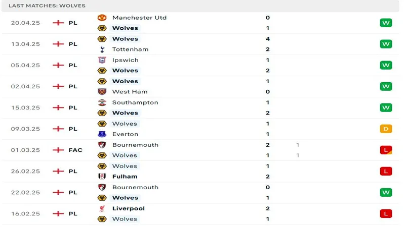 Trong 10 lần đối đầu gần nhất giữa hai đội, Leicester City có thành tích khá tốt, giành được 6 chiến thắng, trong khi Wolves chỉ có 3 lần chiến thắng. Cụ thể, Leicester đã thắng Wolves ở các lần đối đầu gần nhất, ngoại trừ trận thua 0-3 vào tháng 12 năm 2024 và một số trận thua khác.
