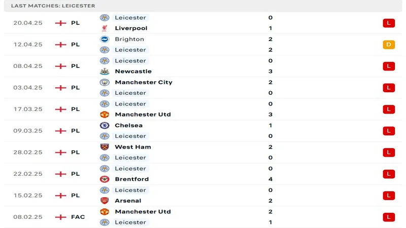 Leicester City đang gặp khó khăn trong các trận đấu gần đây. Họ đã thua 6 trong 8 trận gần nhất, trong đó có các trận thua trước các đội mạnh như Manchester City, Arsenal và Chelsea. Trận hòa duy nhất trong thời gian này là trước Brighton.